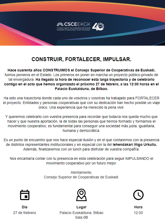Este año celebra su 40 cumpleaños y con tal motivo organiza un acto el próximo 27 de febrero, a las 12: 00 horas en el Palacio Euskalduna de Bilbao al que estamos invitados todas las personas miembros de nuestra Asociación.