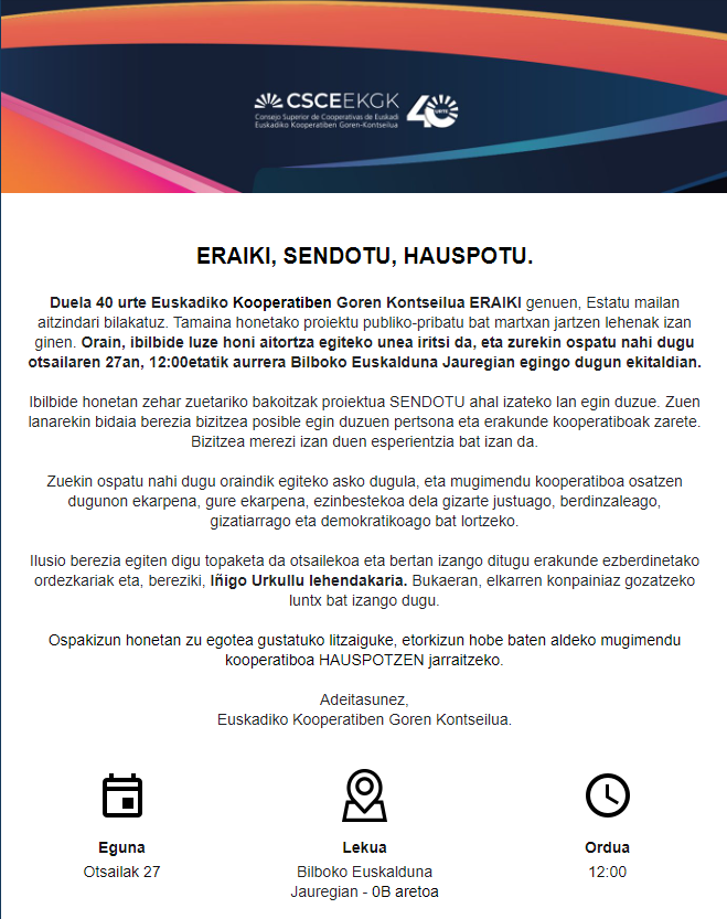 EKGK-Euskadiko Kooperatiben Goi Kontseilua 1983ko urtarrilaren 28an eratu zen formalki, kooperatibagintzaren promozioa eta zabalkundea bermatzeko, eta kooperatiba arloko euskal administrazio publikoen aholkularia ere bada. Kooperatibismoaren eragile guztientzako tresna ERAKARGARRIA izan nahi du, eta BALIAGARRIA, haiek ERALDAKETA EKONOMIKO ETA SOZIALERAKO dituzten asmo komunak lortzeko. Kooperatiben arloan, sustapen, zabalkunde, arbitraje, kontsulta eta aholkularitzarako eta lankidetzarako eginkizunak ditu.…